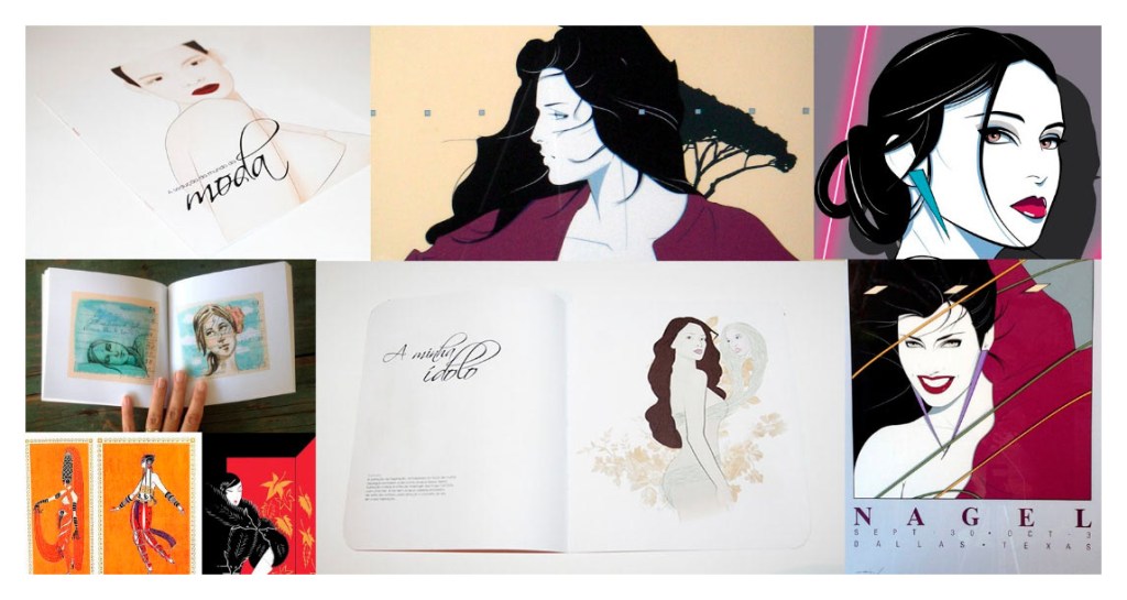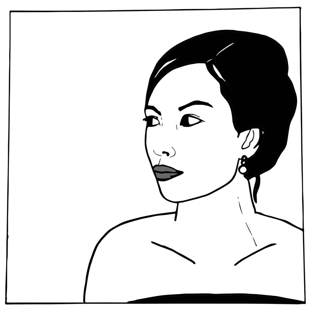 Portraits of family and friends in Patrick Nagel-inspired style with Art Deco and Japanese print influences.