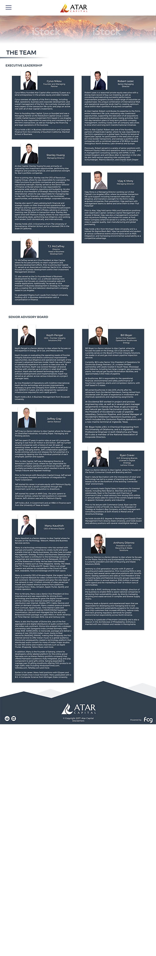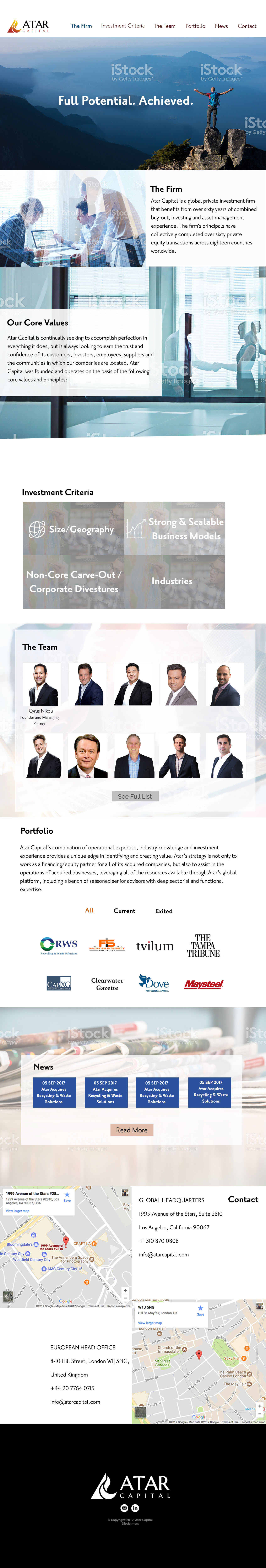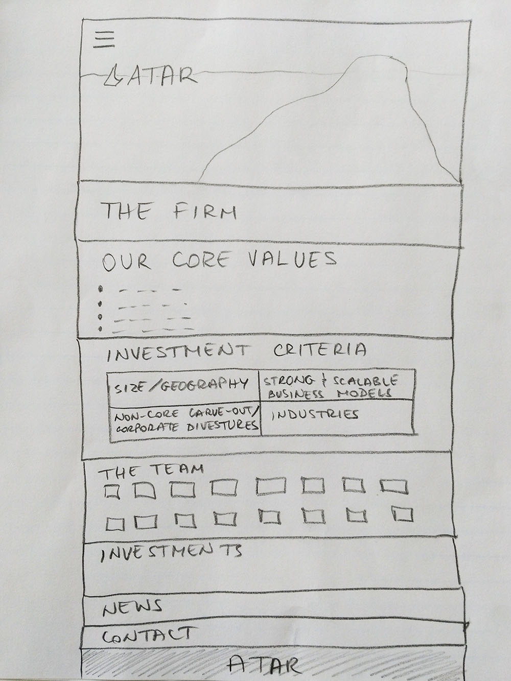 I spent most of the time trying to find a better solution for the Investment Criteria, Team, and Contact sections. While discussing possible solutions with the client, we agreed that these three pages should open up to a new window with additional information showing there. After adding the final edits to the design and after sending them a few more versions of the wireframe and after fixing a few last minor details, the client was happy with the overall design. Below are more detailed images of the redesign of the ATAR website that I created in Sketch. You can see the main page, as well as the team, investments, and contact page.