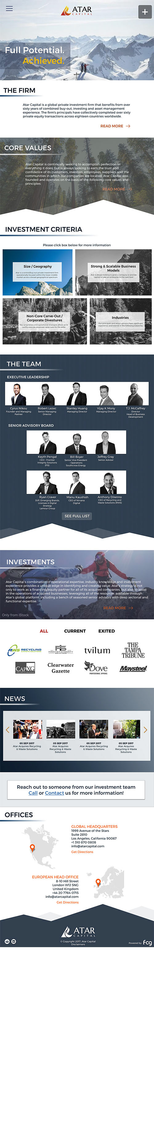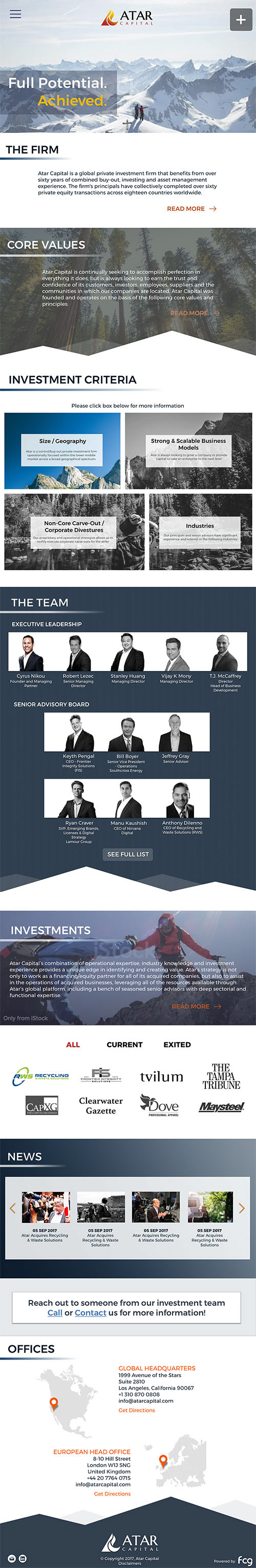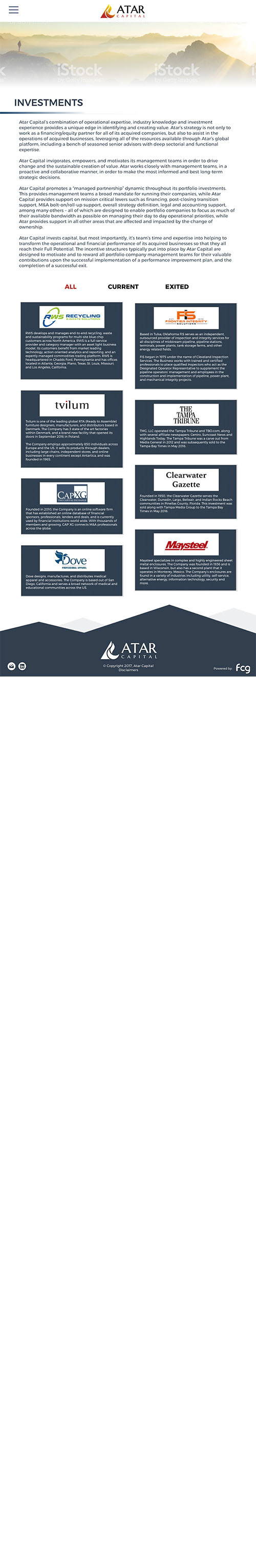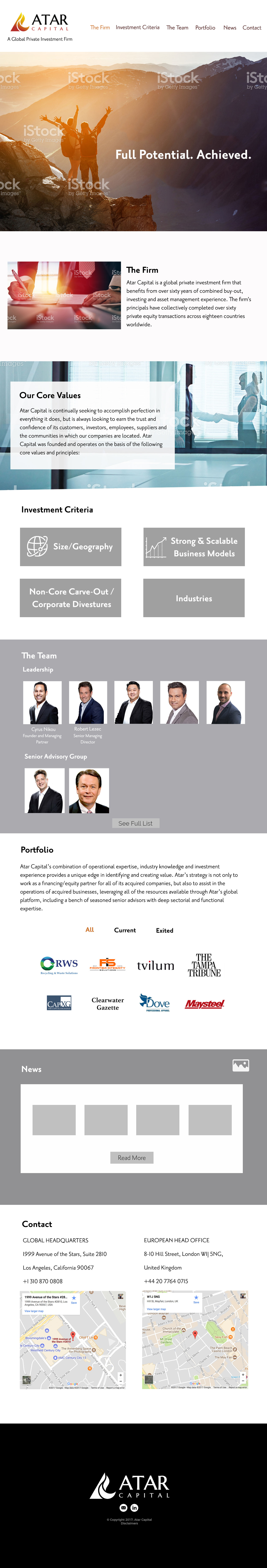I spent most of the time trying to find a better solution for the Investment Criteria, Team, and Contact sections. While discussing possible solutions with the client, we agreed that these three pages should open up to a new window with additional information showing there. After adding the final edits to the design and after sending them a few more versions of the wireframe and after fixing a few last minor details, the client was happy with the overall design. Below are more detailed images of the redesign of the ATAR website that I created in Sketch. You can see the main page, as well as the team, investments, and contact page.