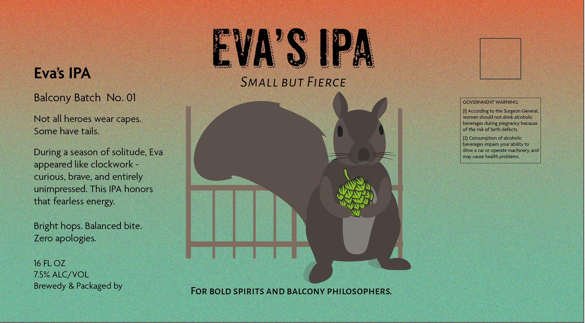 At the heart of the design is Eva — poised, alert, and holding a hop cone like a trophy. She represents resilience, curiosity, and quiet confidence.