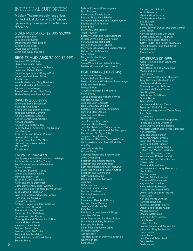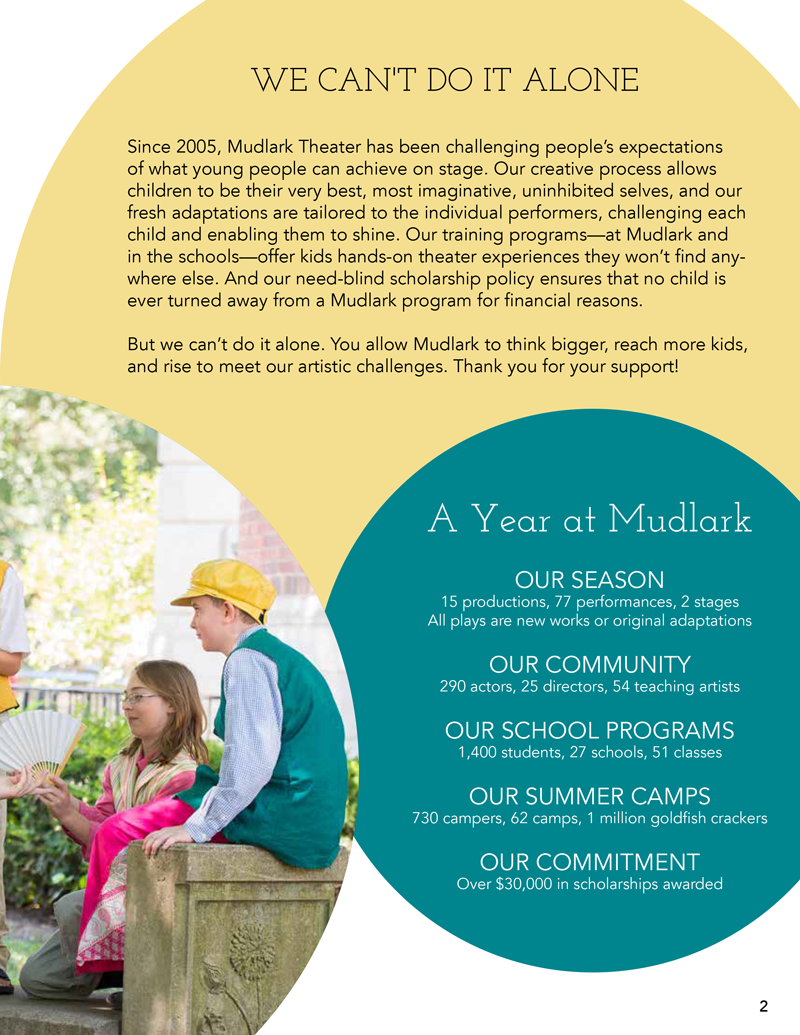 Editorial design for a multi-page annual report highlighting Mudlark Theater’s 2017 activities, performances, and community impact.