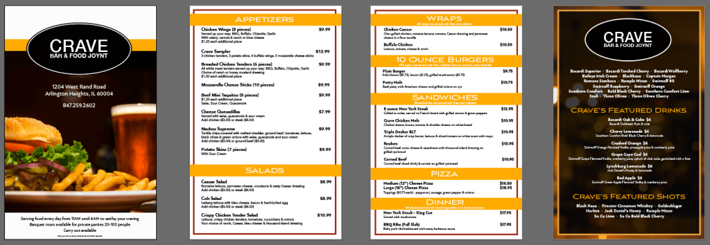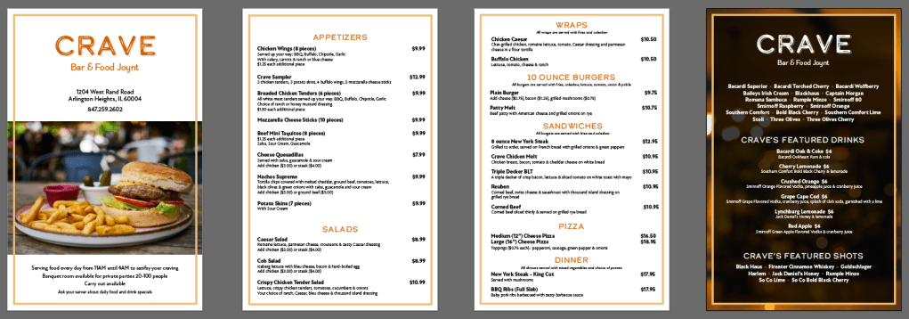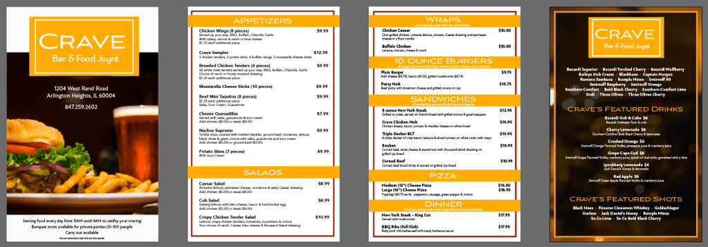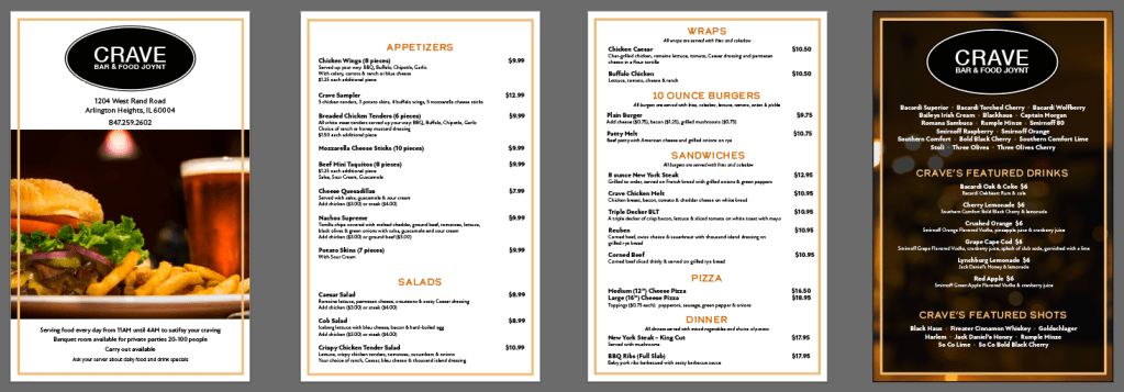 Redesigned the menu for Crave, a restaurant, updating an older version to improve clarity, hierarchy, and visual appeal. The project included exploring multiple layout and typographic concepts to find the most effective solution for customers and staff alike.