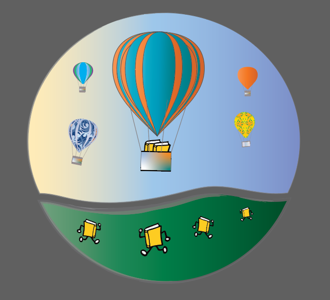 Concept: An open book becomes the launch point for hot-air balloons, symbolizing stories crossing borders, cultures, and languages.
