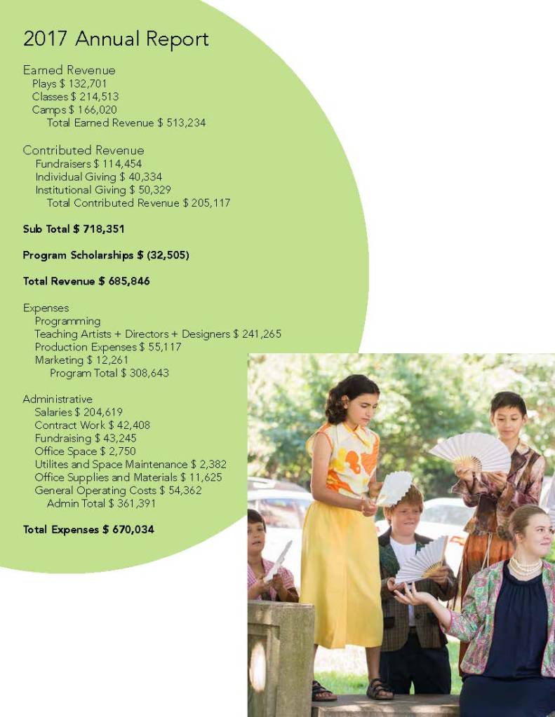 Comprehensive annual report for nonprofit theater, highlighting activities, donors, and visual storytelling in print.
