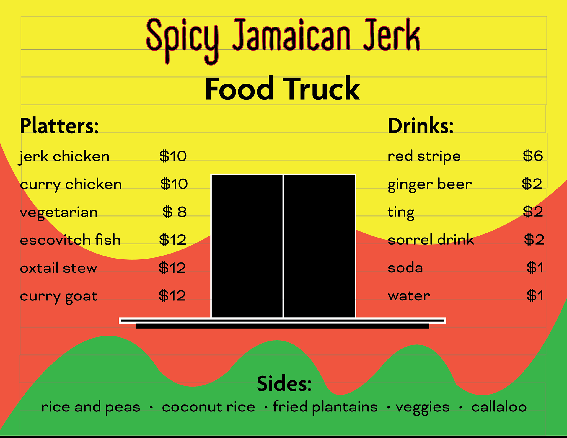 This self-initiated concept menu was inspired by a local Jamaican food truck I visited. While the food was excellent, the truck did not have a clearly displayed menu, creating an opportunity to explore a bold, readable menu design suited for a small, fast-paced food service environment. The layout and color palette reference the truck's structure and cultural identity while prioritizing clarity and readability in a fast-paced food truck environment.